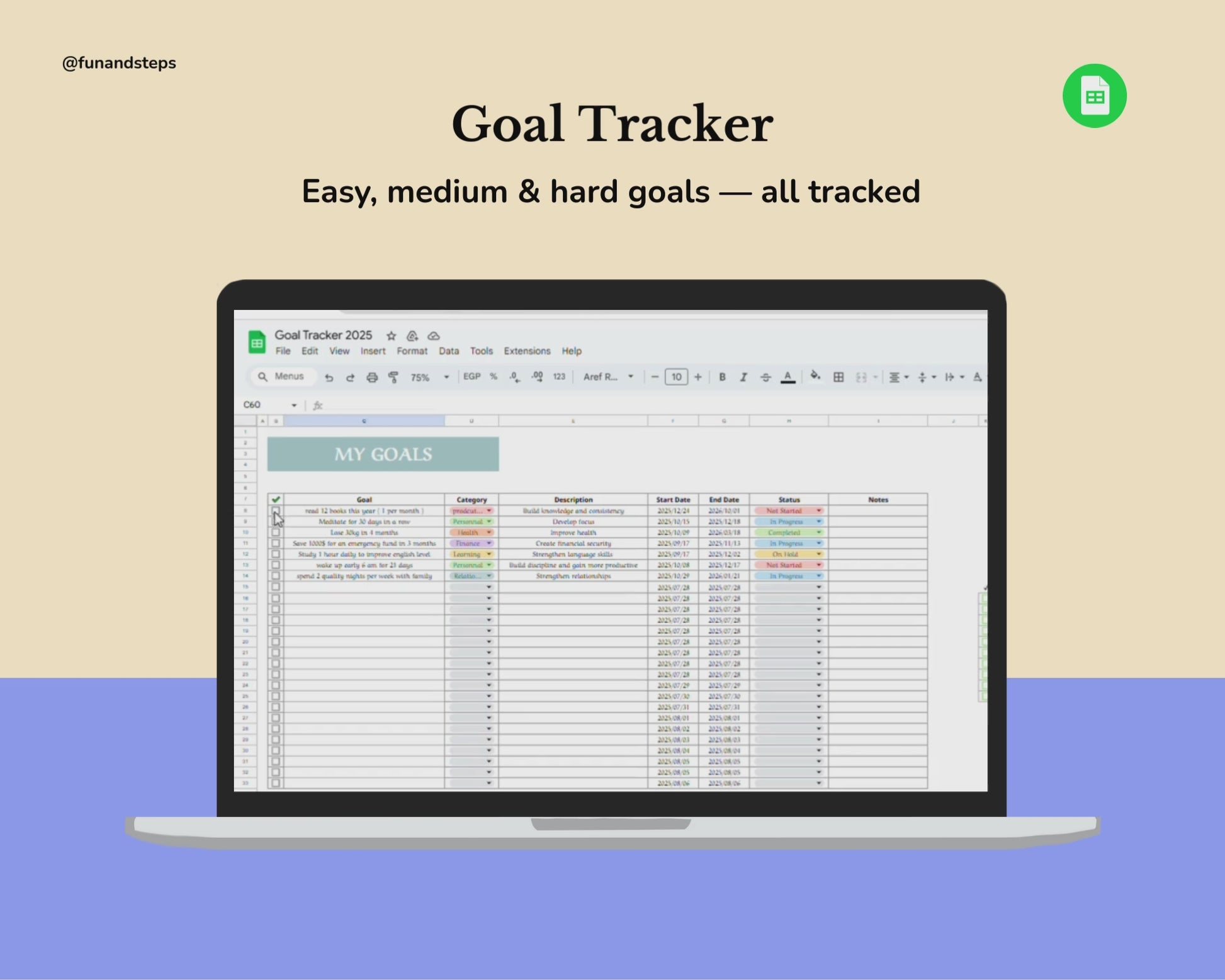 ✔️ Goal Table for Clarity – Organize every goal with Goal, Category, Description, Start Date, End Date, Status so you always know where you stand.